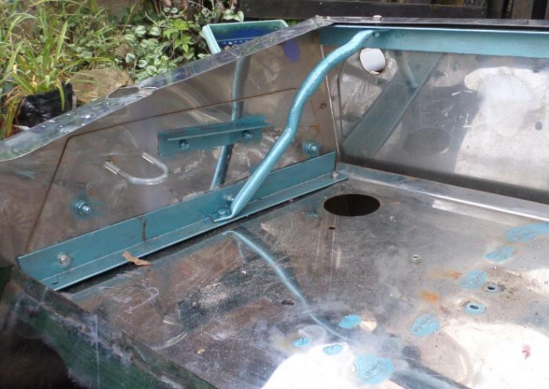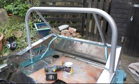 This week saw me finishing cutting off the last of the rustybits on the shell and started fitting some new parts. The last part to take off was the gearbox mount, the mount itself had fallen apart but the bolts remained, so out with the angle grinder and that was soon sorted, the bolt into the gearbox after soaking in wd40 and tapping with a hammer leaving overnight-snapped with about 5lb torque applied good quality bolt ! I continued adding strengthening plates to the roll cage/seat belt mountings, got the roll bar rubbed down primed and then sprayed silver with 3 or 4 coats of lacquer, got it fitted into placce bolted up and welded onto the base plate. Next job on the rear end will be trimming and fitting the rear arches temporarily as they will need taking off to get painted.
