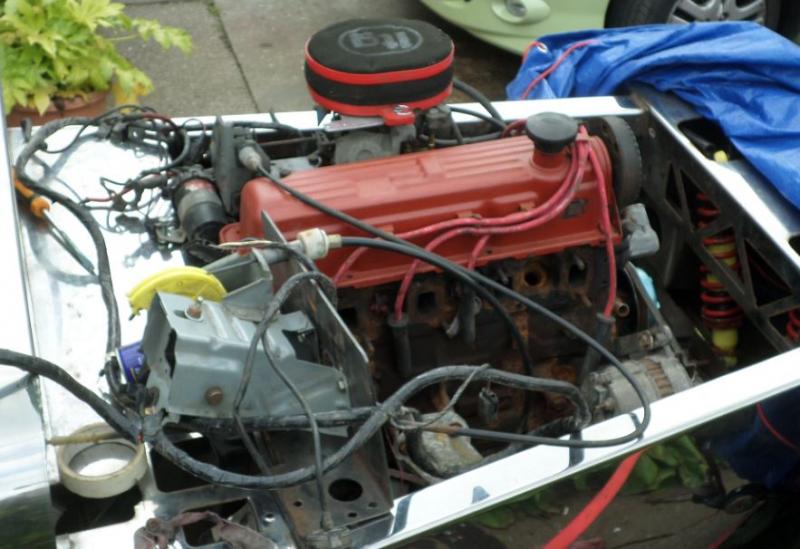 I moved on to the front end the shell to fit some angle iron inside the u section where it joins the bulkhead, the Exmo developed cracks around this point so a 2 foot length of angle iron was bolted each side to stiffen the weak point, I will be putting some plate on the floor where it joins the bulkhead as well but I need other things positioned first. Moving on to trying to get the engine started i raided my spares and fitted good altenator, starter, weber carb and manifold, and distibutor. I also found a Sierra engine wiring loom which will be used temporarily until the new loom goes in.