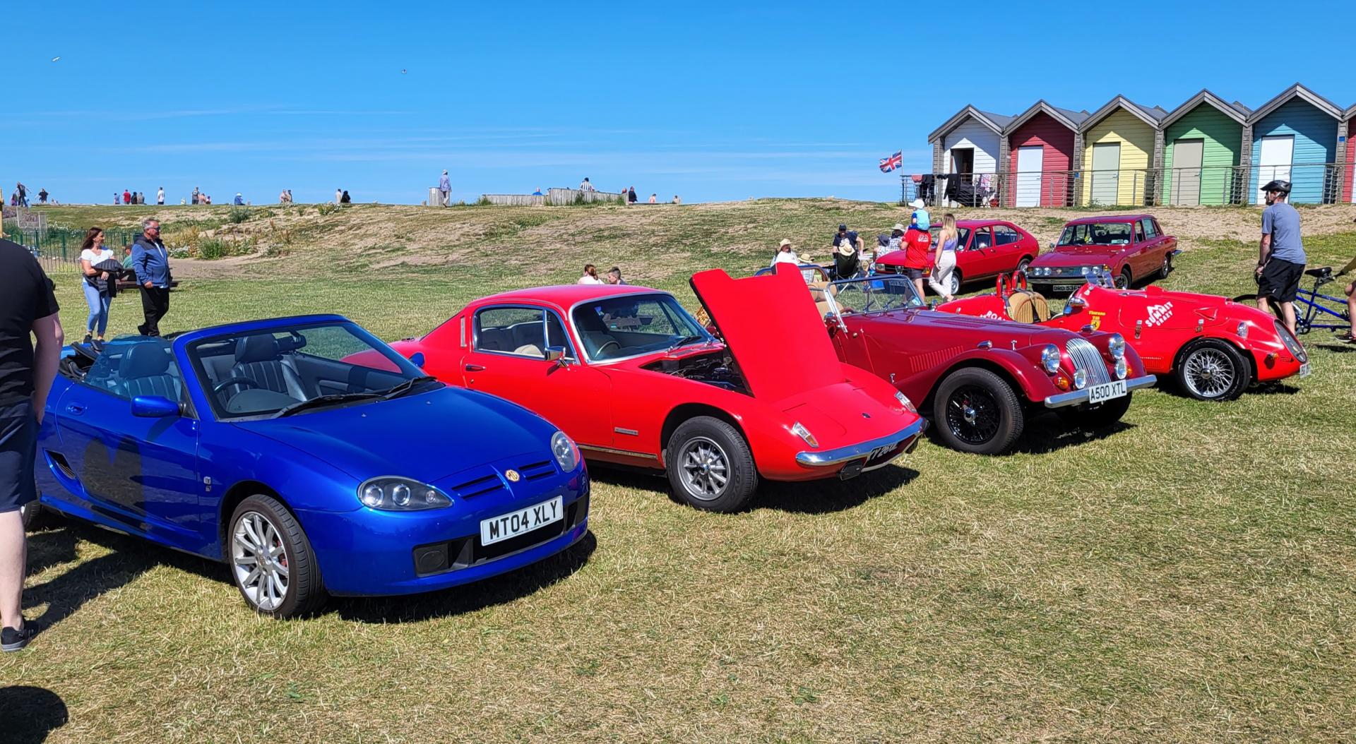 Those showing their cars arrived early at the Mermaid Car Park at Blyth seafront and joined together before entering the show so that we would be parked together.  Alan brought his Robin Hood (as did John & Margaret and Mike & Denise); Keith brought his Lotus; Liz brought her MGF while Arthur brought the Lotus; John & Dorothy came in their Hawk and Pearson completed our display with his Fiarano.  We were happy to make use of the vouchers for a free bacon (or sausage) roll and cup of tea or coffee before taking up our places and displaying the club banner ready for the day's show.  Eventually we were joined by about 130 others to create another successful show at Blyth.