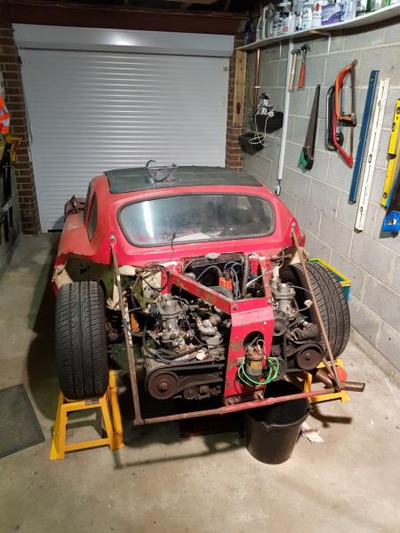Things went better than expected and we've made a start. Engine exposed by removing the rear end bodywork and electrics and pipework all disconnected.